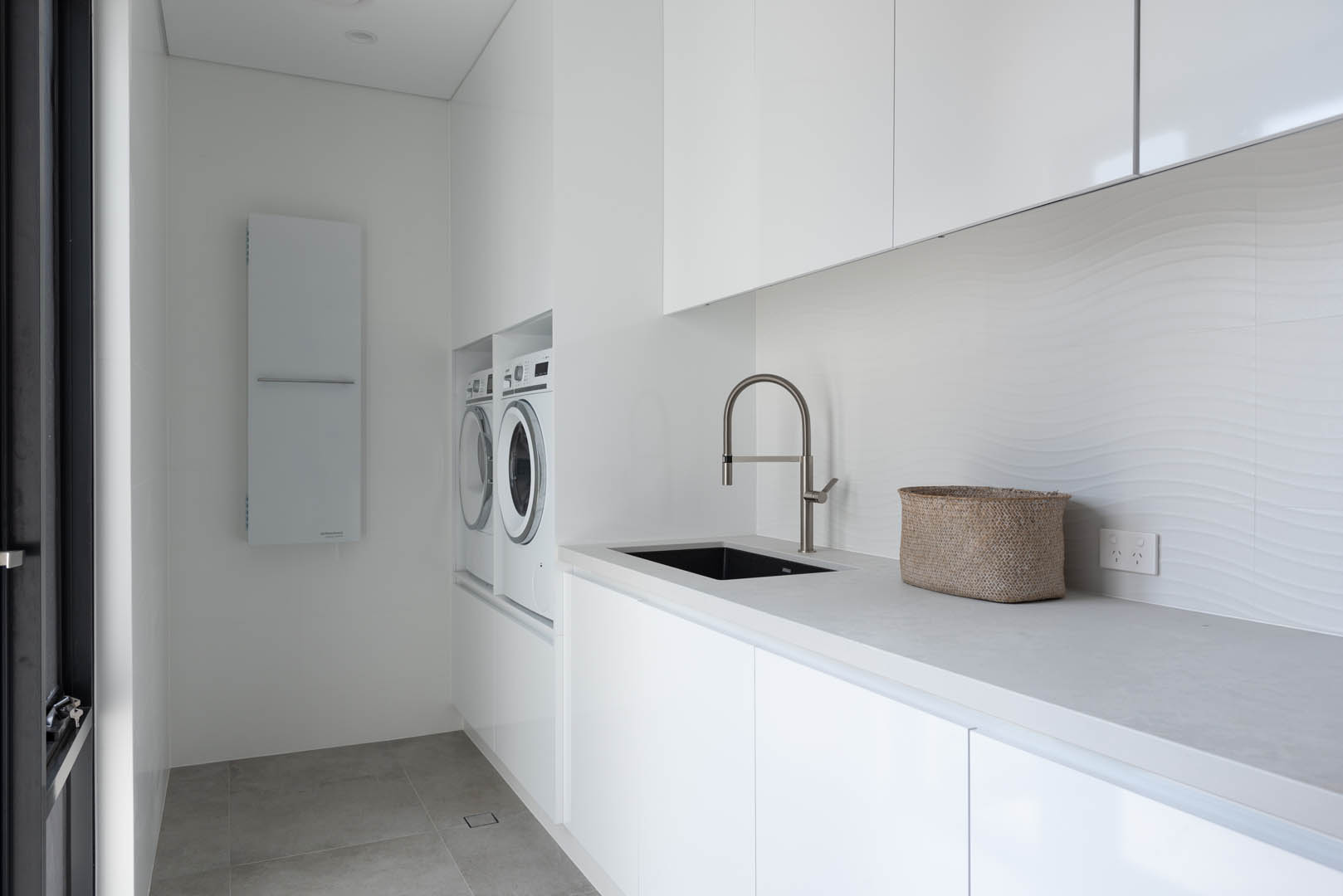 Ergonomic laundry with raised appliances and smart storage